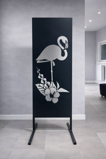 A szerkezet stabilitását a 20×20 mm-es zártszelvényből készült masszív keret biztosítja, amely hosszú élettartamot és megbízható tartást garantál. A belső kitöltést 1,5 mm vastag, mintázott acéllemez alkotja, amely nemcsak erős és ellenálló, hanem modern, karakteres megjelenést is kölcsönöz a térelválasztónak.