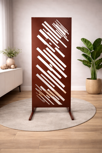 A szerkezet stabilitását a 20×20 mm-es zártszelvényből készült masszív keret biztosítja, amely hosszú élettartamot és megbízható tartást garantál. A belső kitöltést 1,5 mm vastag, mintázott acéllemez alkotja, amely nemcsak erős és ellenálló, hanem modern, karakteres megjelenést is kölcsönöz a térelválasztónak.