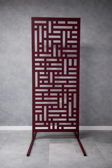 A szerkezet stabilitását a 20×20 mm-es zártszelvényből készült masszív keret biztosítja, amely hosszú élettartamot és megbízható tartást garantál. A belső kitöltést 1,5 mm vastag, mintázott acéllemez alkotja, amely nemcsak erős és ellenálló, hanem modern, karakteres megjelenést is kölcsönöz a térelválasztónak.