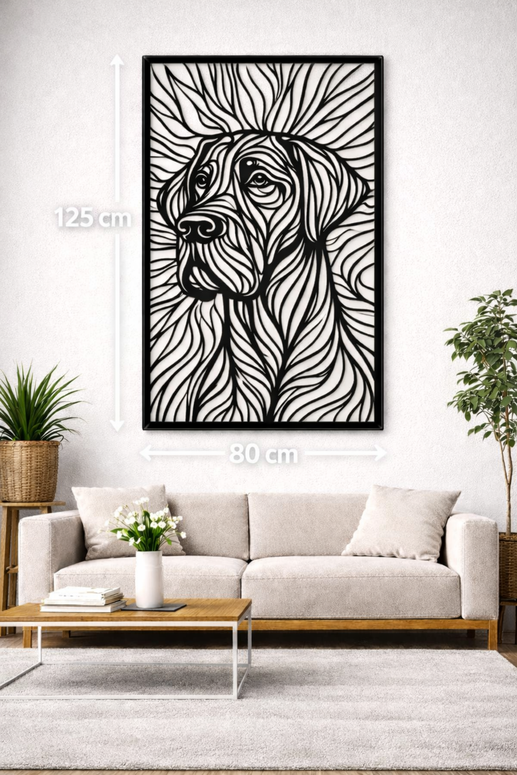 A Őrző falikép a védelem, hűség és bizalom erőteljes szimbóluma. A tekintélyt sugárzó kutyaalak nemcsak dekoráció, hanem egyfajta jelenlét is a térben – mintha csendben vigyázná az otthont. A dinamikus, egymásba futó vonalak erőt és karaktert adnak a mintának, miközben modern, letisztult stílust képviselnek.